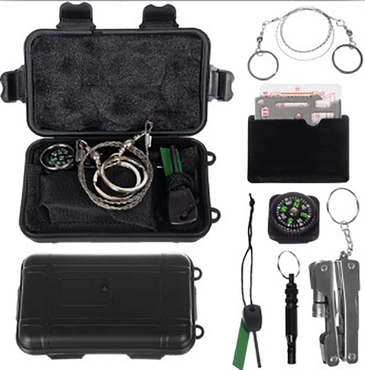 De kit bestaat uit: fluit, kompas, reddingsdeken, draadzaag, mulifunctionele tang, multifunctionele 11 in 1 survival multi tool en wordt gelverd in een prachtige opbergdoos.