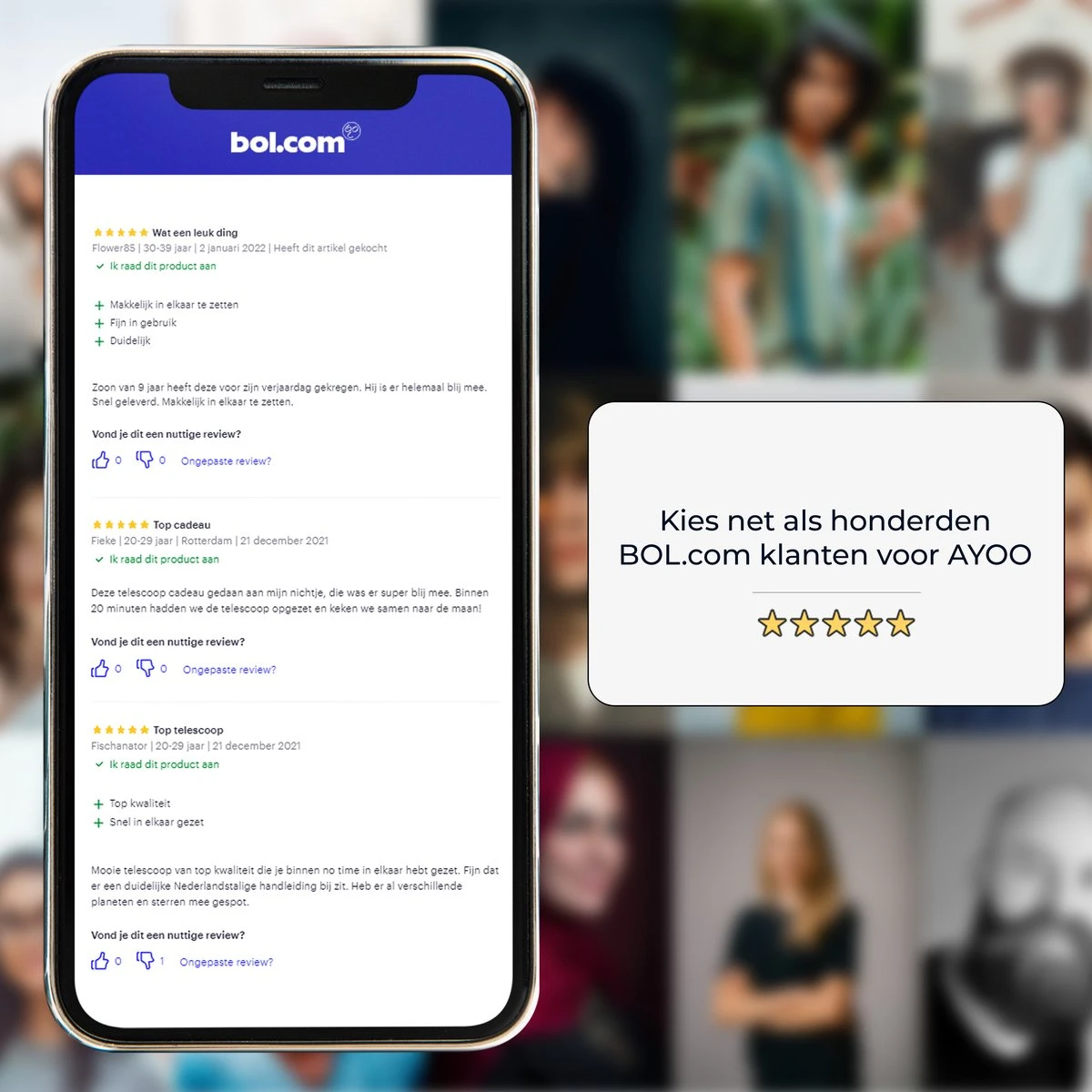 Bij AYOO streven wij altijd naar 100% klanttevredenheid. Wij zijn dan ook erg trots op onze winkelbeoordeling. Mocht je vragen hebben over het product, stuur dan gerust een bericht naar Bol Support en wij beantwoorden jouw vraag altijd binnen 24 uur. Is het product niet naar wens of werkt het niet naar behoren? Bij ons kun je binnen 30 dagen altijd volledig kosteloos annuleren en retourneren. Daarnaast bieden we altijd een onvoorwaardelijke garantie van 12 maanden!