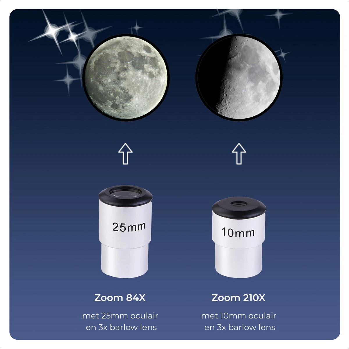 De sterrenkijker wordt geleverd in een set, die veel meer bevat dan alleen een telescoop. Zo ontvang je twee standaard lenzen (25mm en 10mm) en een 3x barlow lens, die zorgt voor een extra grote vergroting. Ook bevat de set een finder scope die helpt bij het vinden van planeten en andere objecten. Naast de verschillende lenzen wordt deze telescoop set geleverd met een smartphonehouder. Wanneer je jouw telefoon hierin plaatst maak je eenvoudig de mooiste foto’s van de sterren en planeten waar je op dat moment naar kijkt. Uiteraard wordt dit alles compleet gemaakt door een stevig statief. De telescoop kan eenvoudig op het statief wordt geplaatst, die ook nog eens in hoogte verstelbaar is. Dit alles kan gemakkelijk en veilig worden opgeborgen in de meegeleverde opbergtas.