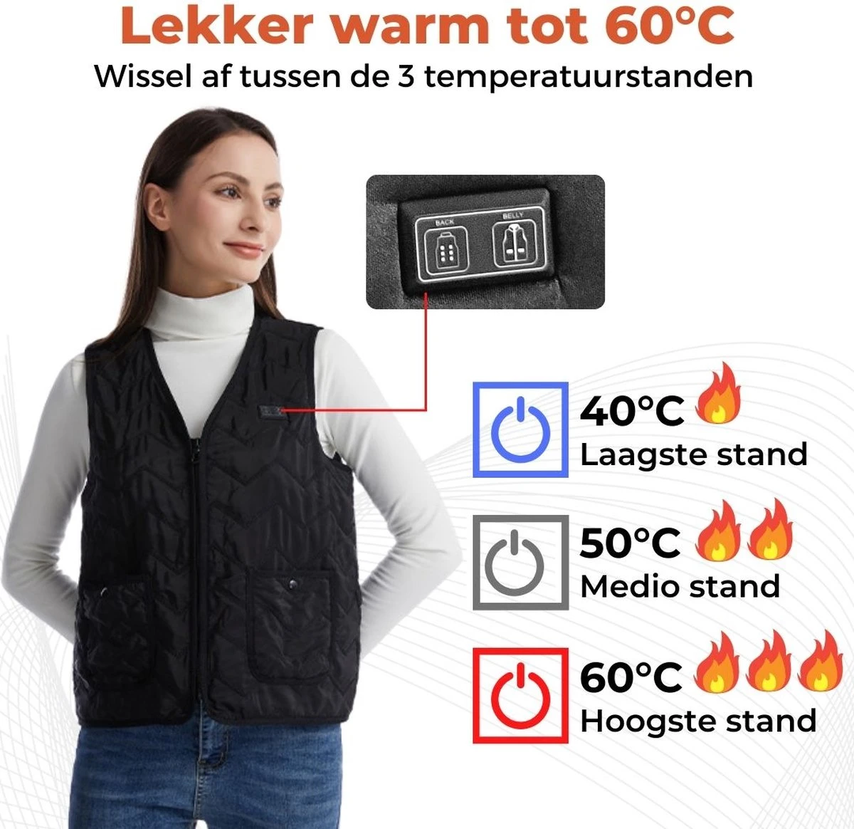 - Behoud tot 7 uur lang je lichaamswarmte – dankzij de sterke accu blijft je lichaam lekker warm tijdens de koude winterdagen.