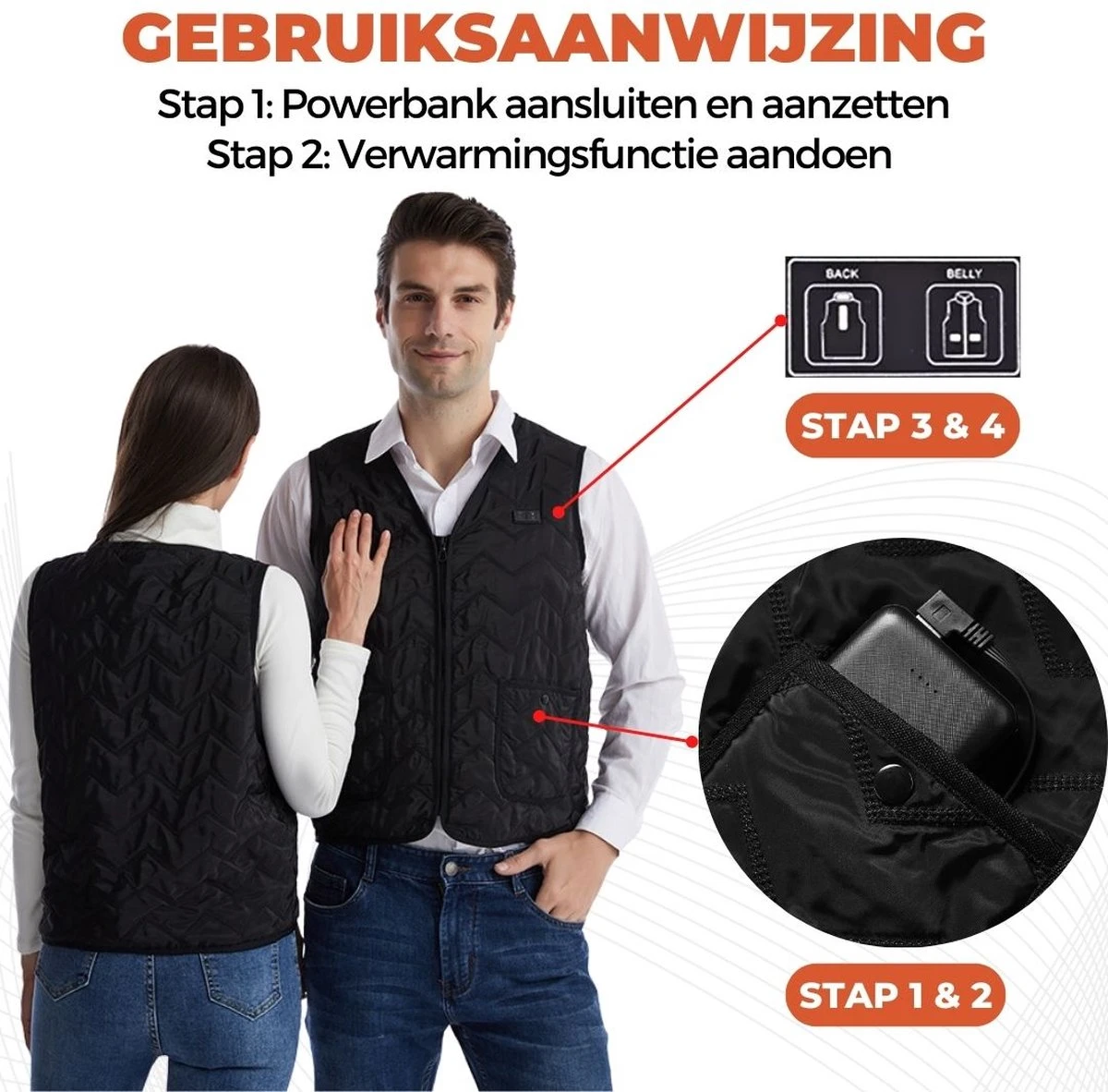 De bodywarmer wordt van stroom voorzien door de draagbare 10.000 mAh powerbank en is eenvoudig op te laden via een USB-oplaadkabel. Dankzij het hoge accuvermogen kan de bodywarmer tot 7 uur worden gebruikt op het laagste warmteniveau (wit licht), 5 uur op middelhoog warmteniveau (blauw licht) en 3 uur op het hoogste niveau (rood licht).