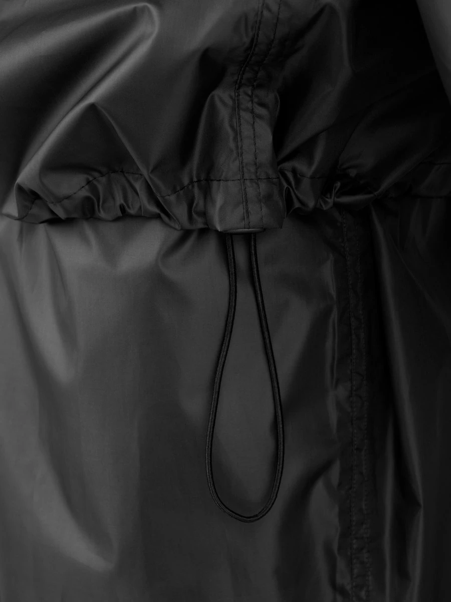 De rits van de regenjas is verdekt met een beschermende flap met drukknopen. De capuchon is afritsbaar en verstelbaar met een koord. Ook de taille boord is verstelbaar met een elastisch koord. De mouwen hebben elastische manchetten. De jas heeft twee heupzakken met knoopsluiting. Het is een ruime fit waardoor de jas goed over kleding is te dragen. De regenjas is voorzien van reflectie op de borst en rug voor extra zichtbaarheid in het donker.