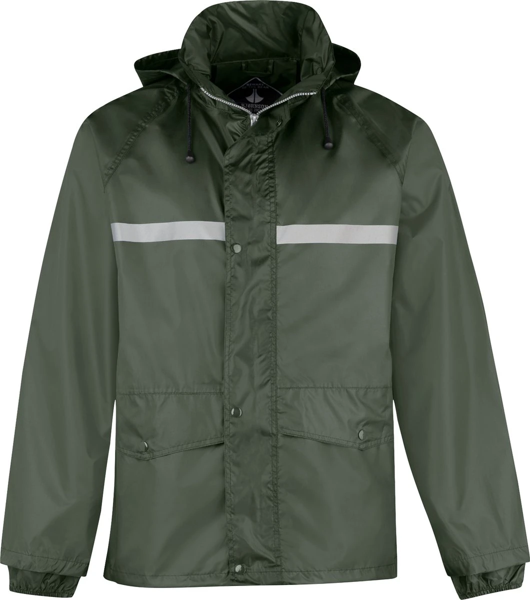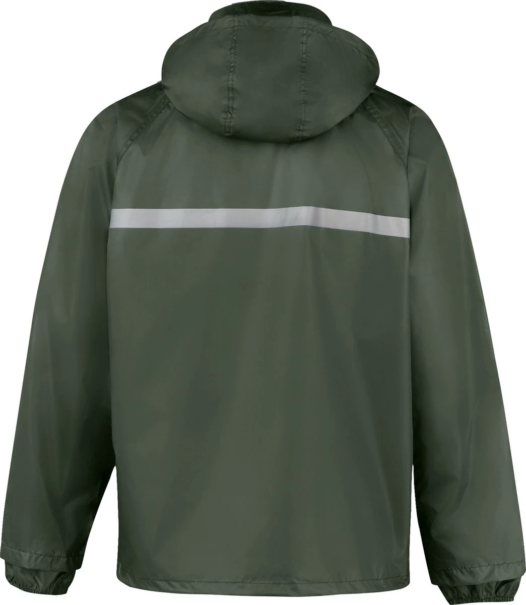 De rits van de regenjas is verdekt met een beschermende flap met drukknopen. De capuchon is afritsbaar en verstelbaar met een koord. Ook de taille boord is verstelbaar met een elastisch koord. De mouwen hebben elastische manchetten. De jas heeft twee heupzakken met knoopsluiting. Het is een ruime fit waardoor de jas goed over kleding is te dragen. De regenjas is voorzien van reflectie op de borst en rug voor extra zichtbaarheid in het donker.