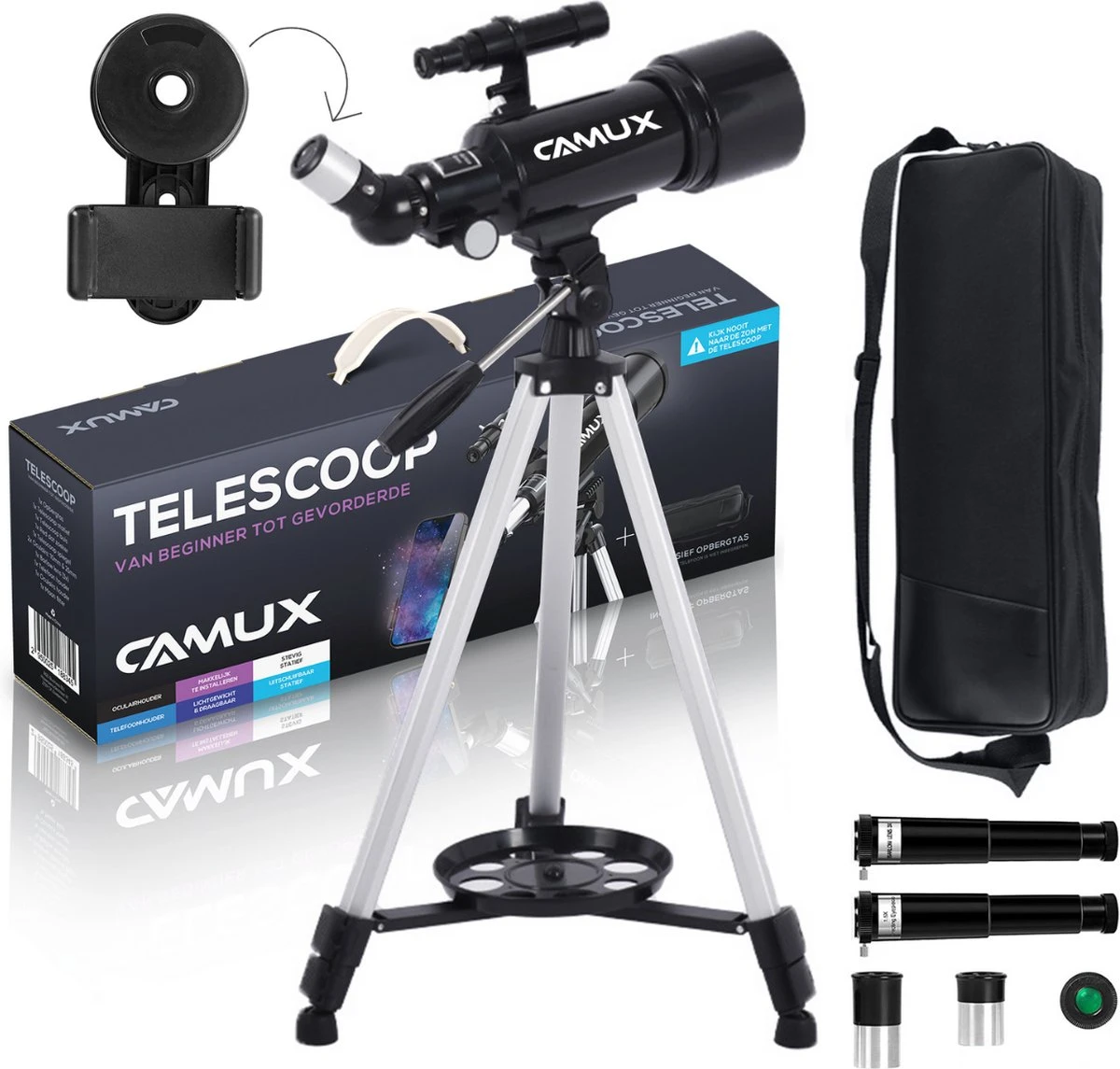 De CAMUX telescoop is uitgerust met 400 mm brandpuntsafstand, een 70 mm diameter lens en een Barlow lens van 3x vergroting om verbluffende beelden te kunnen zien. Verder beschikt de telescoop over hoogwaardige, volledig FMC gecoate lenzen die het beeld verbeteren en je ogen goed beschermen.