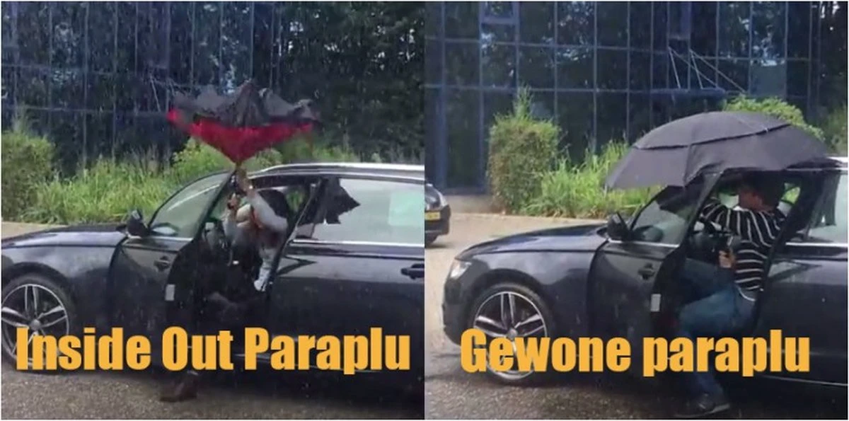 Inside Out paraplu, dubbeldoeks, windproof, zwarte stok en glasfiber frame en easy opening systeem. Het speciale ontwerp maakt het mogelijk dat deze paraplu – wanneer gesloten – volledig op zichzelf op de grond kan worden geplaatst, dus zonder enige ondersteuning en is uitgerust met een speciale C-vormige handvrije greep.