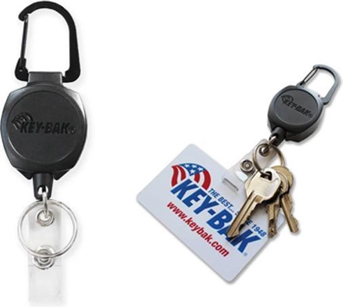 Retractor met 60cm Kevlar koord en splitring en pashouder aan het uiteinde. Voorzien van karabijnhaak, om bijvoorbeeld aan een riemlus te bevestigen. Draagkracht van ongeveer 113 gram.