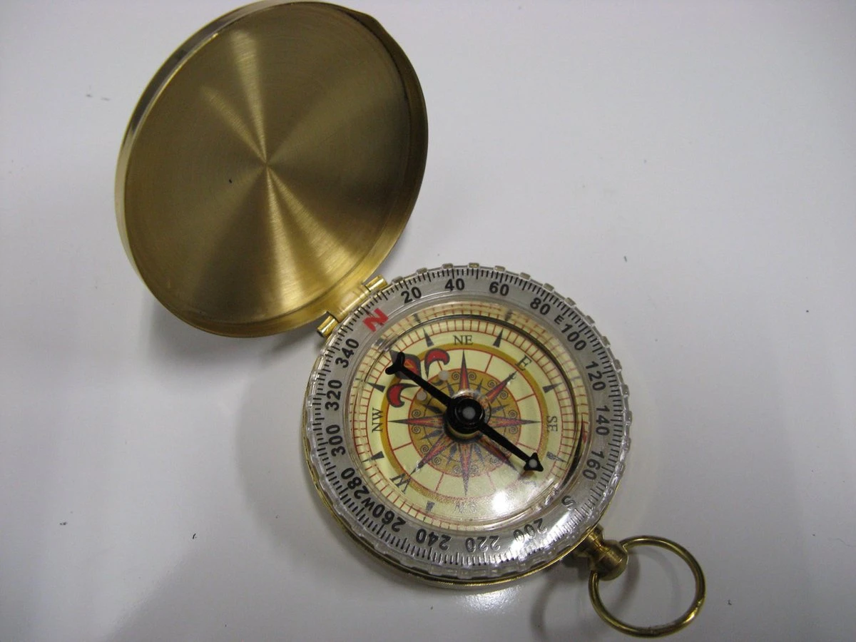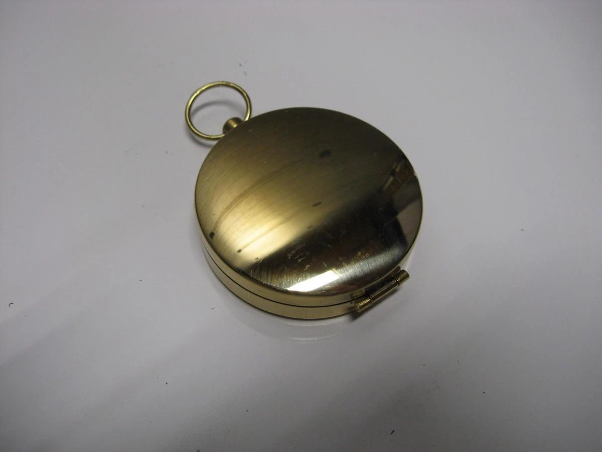 Messing zak kompas met fluorescerende buitenring, diameter 50 mm, dikte 16 mm.