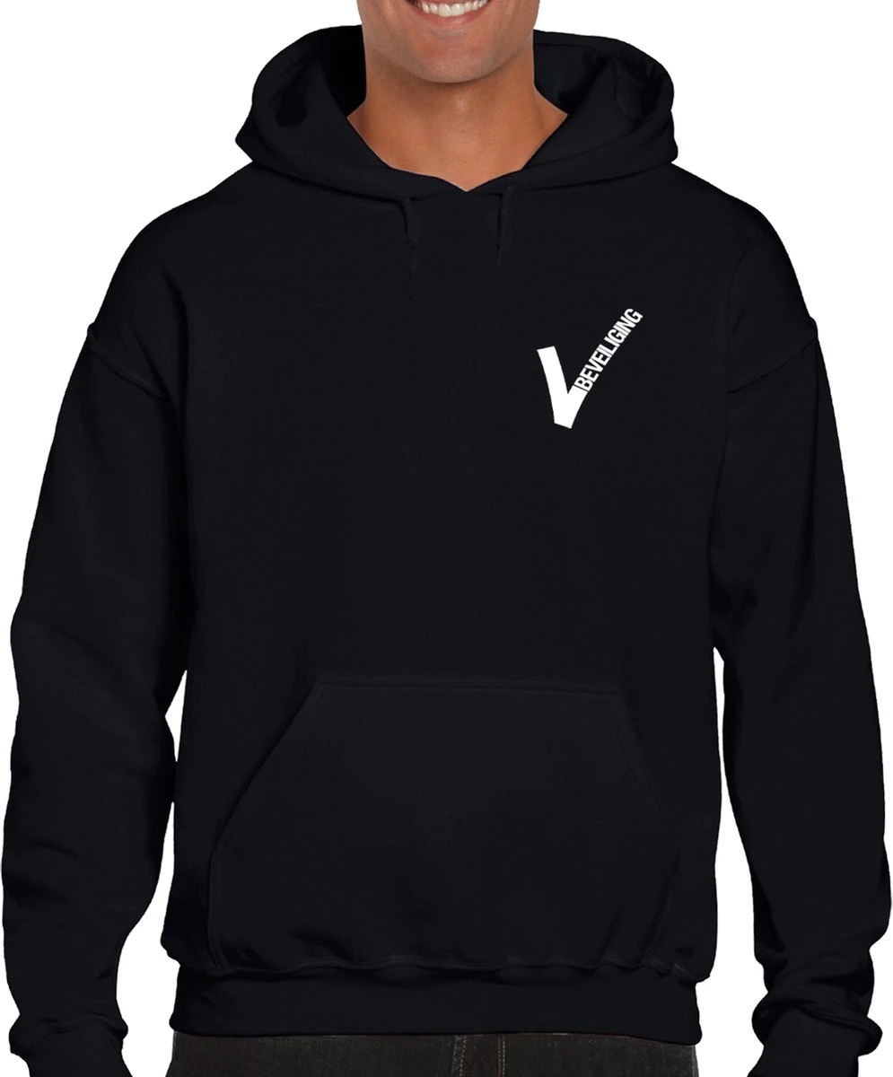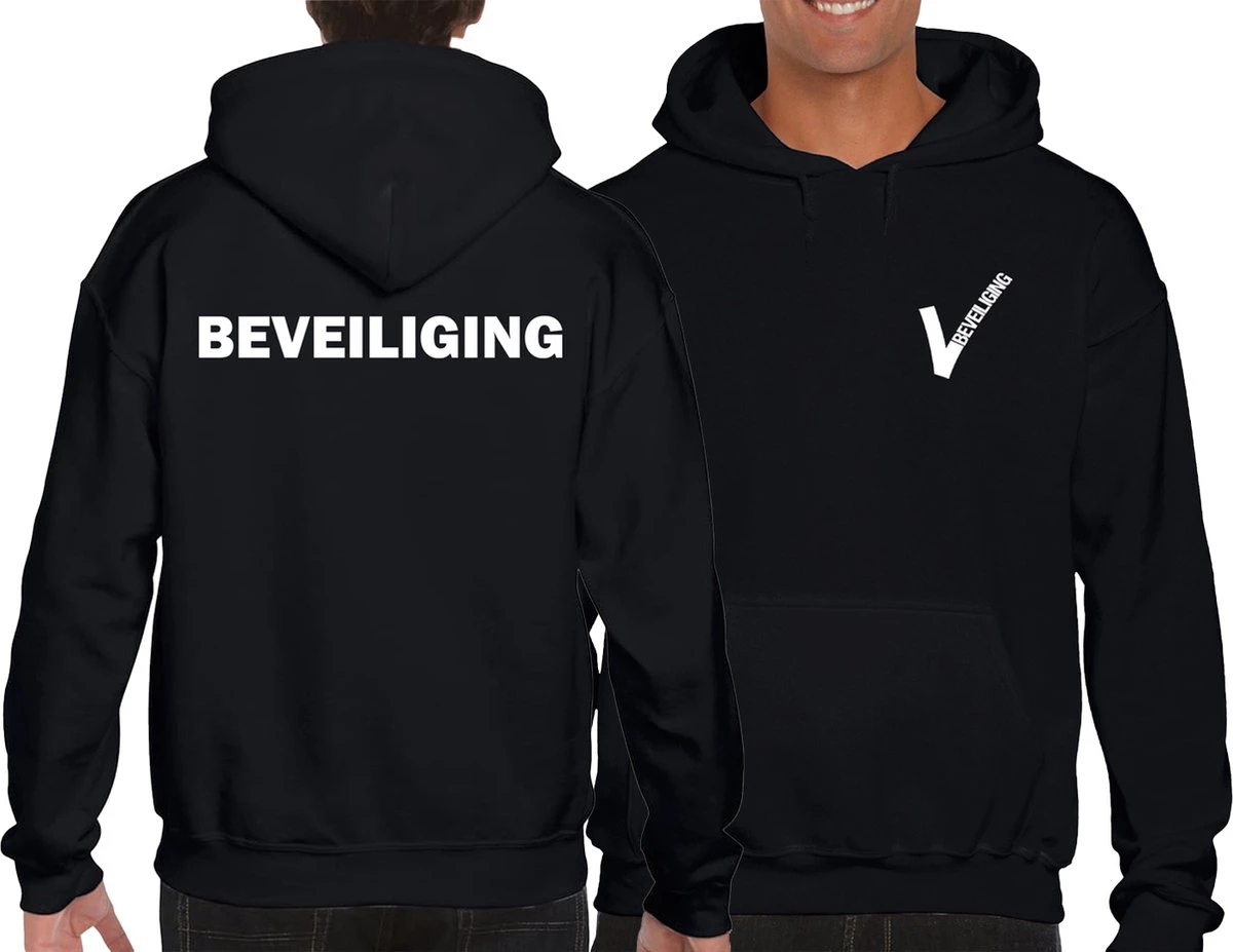 Als je beveiliger bent, mag deze hoodie natuurlijk niet ontbreken tijdens je werk. Op de achterkant vind je de tekst BEVEILIGING en op de linkerborst de welbekende V, met ook daarin verwerkt de tekst BEVEILIGING (zie foto’s)