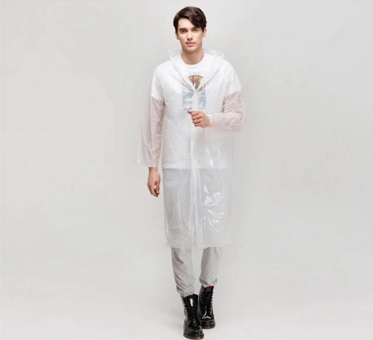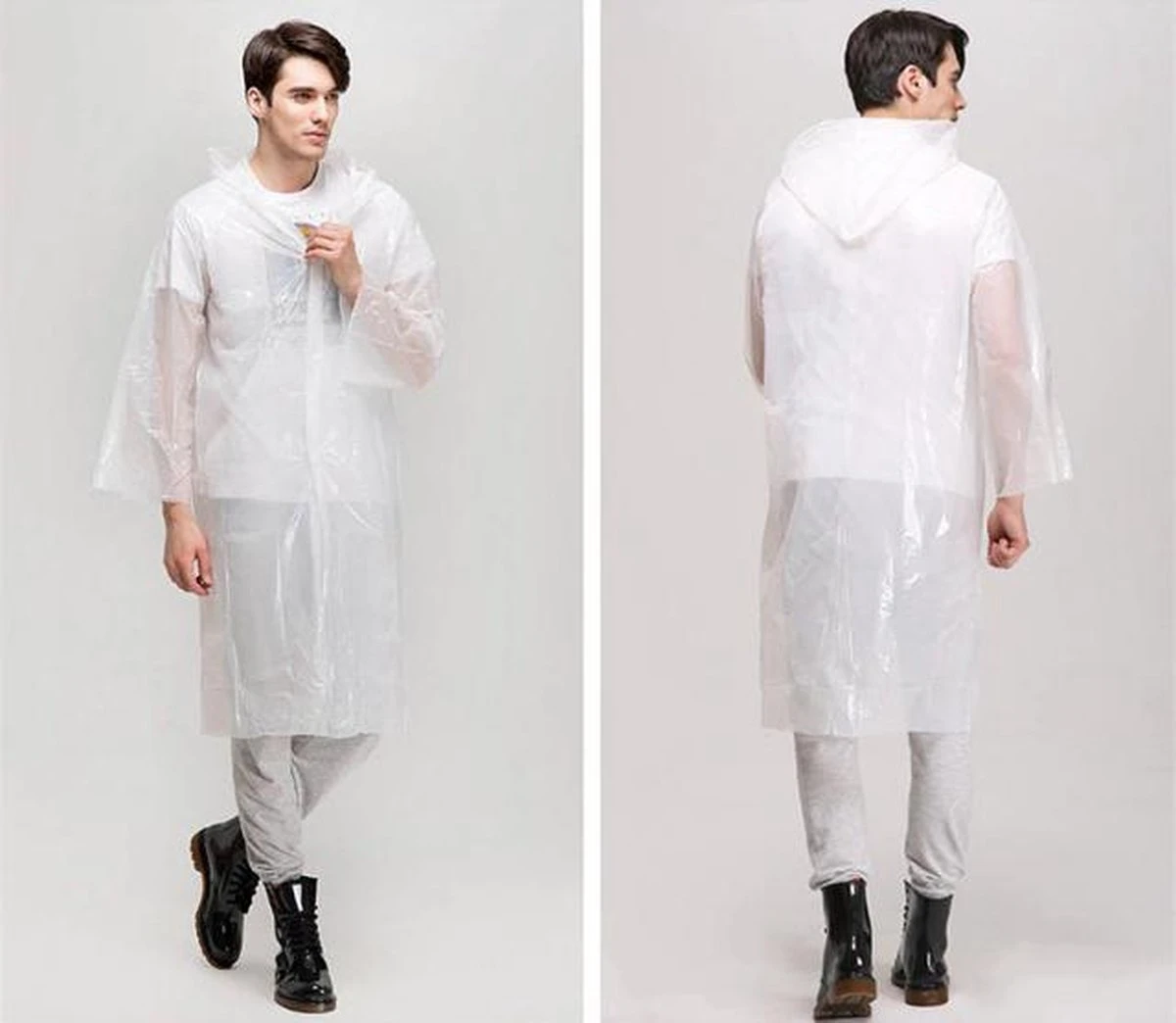 Stijlvolle transparante regenjas met capuchon. Sluiting met drukknopen en waterdichte naden. De regenjas is gemaakt van EVA. Universeel pasbaar met een lengte van 115 cm.