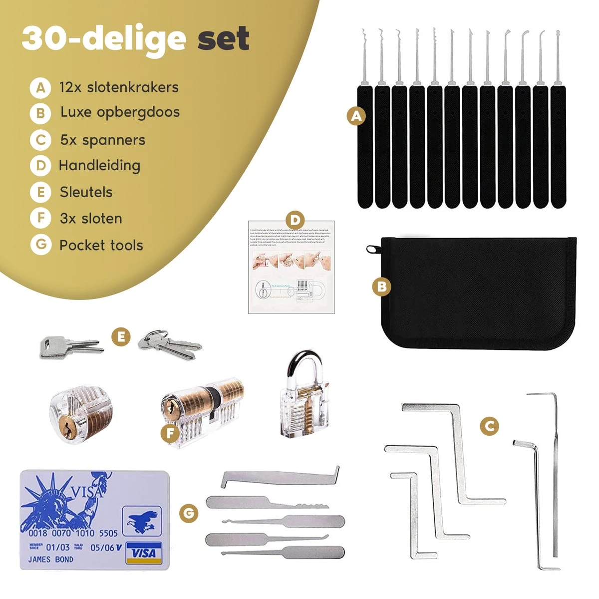 De meest complete set – De lockpick set bevat maar liefst 30 onderdelen zodat jij urenlang plezier kunt hebben met het kraken van de sloten.