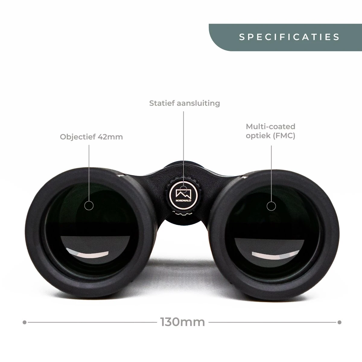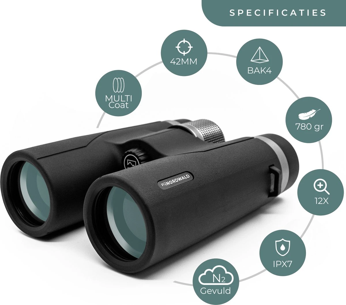 De Nordwald verrekijker is een compact dakkant type en weegt slechts 780 gram. De verrekijker komt met een stevige draagtas en een comfortabel nekkoord. Zo kun je hem snel inpakken en meenemen! Daarnaast is de behuizing van de verrekijker gemaakt van rubber waardoor hij schokbestendig is, antislip en niet makkelijk uit je handen glipt.