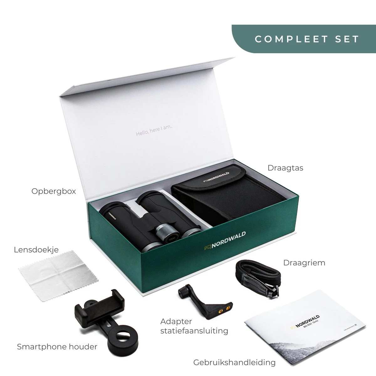 Ga jij graag de natuur in, of zoek je een kwalitatief goede kijker om vogels te spotten. Deze hoogwaardige gebruiksvriendelijke verrekijker van Nordwald is gevuld met stikstof, daardoor is de verrekijker volledig water- en stofdicht. De verrekijker wordt tevens geleverd met een smartphone adapter en een adapter om de verrekijker te gebruiken in combinatie met een statief. Met deze verrekijker beleef je elk moment 8x dichterbij. De smartphoneadapter maakt het eenvoudig om je ervaringen op te nemen tijdens het vogelspotten of bij voetbalwedstrijden en concerten. De BAK4 prisma en de full multi-coated (FMC) lenzen garanderen een hoge resolutie en helder zicht, zelfs als het schemert. De extra grote 18mm ooglenzen maakt deze verrekijker tevens ideaal voor brildragers. Nordwald staat garant voor kwaliteit. Het complete set wordt geleverd in een mooie opbergdoos, zo houdt je alles netjes bij elkaar. De verrekijker van Nordwald is geschikt voor volwassenen en kinderen. De verrekijker is inclusief draagriem, draagtas, lensdoppen, statiefadapter en een smartphonehouder.