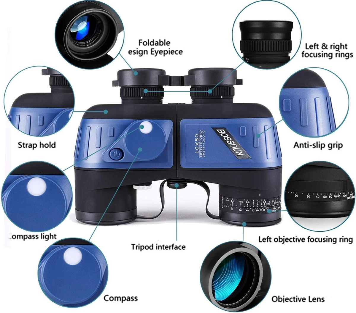 - Marine-verrekijker met 10x vergroting en 50 mm lens, 22 mm oogafstand, 6,8 mm uittredepupil en een gezichtsveld van 132 meter op 1000 meter.