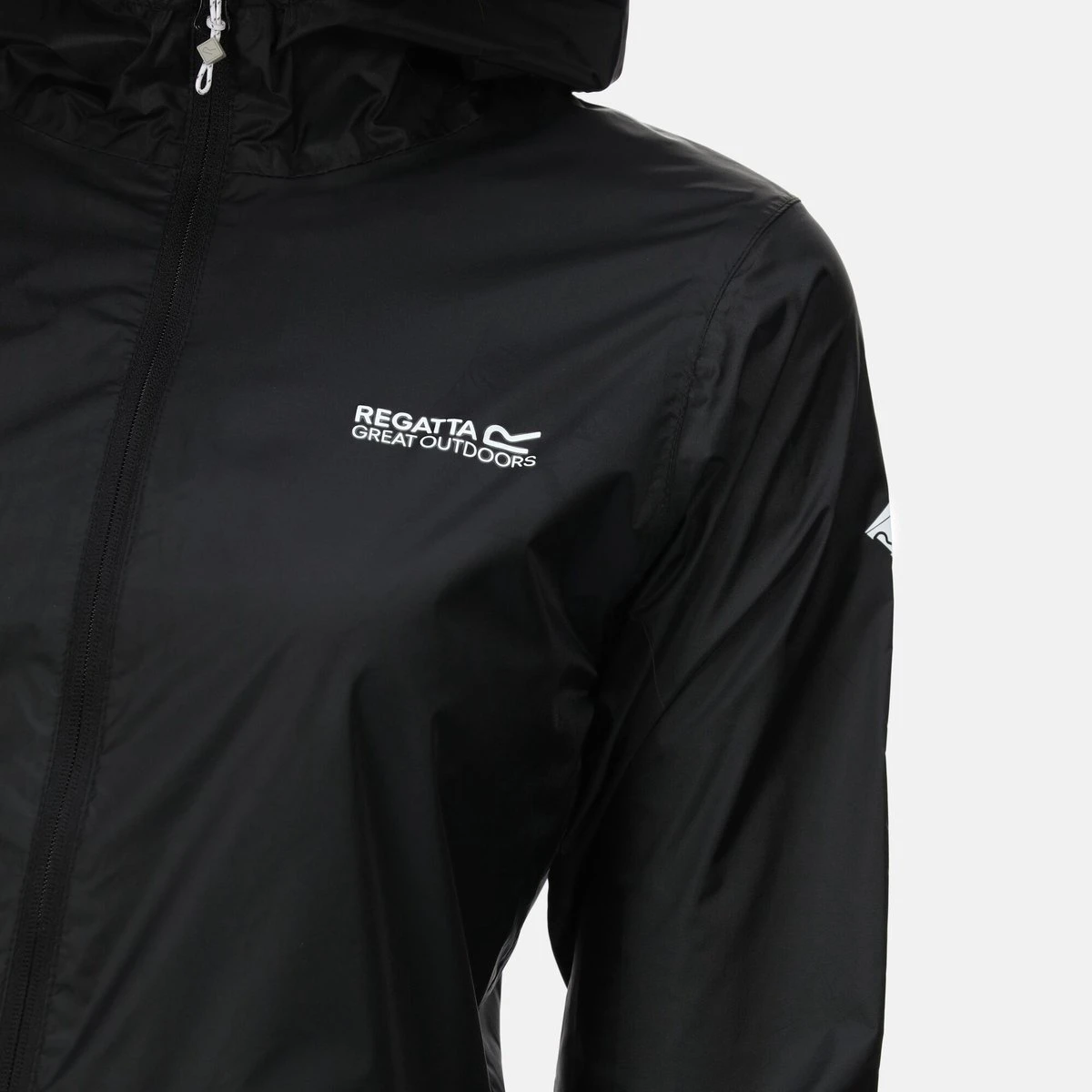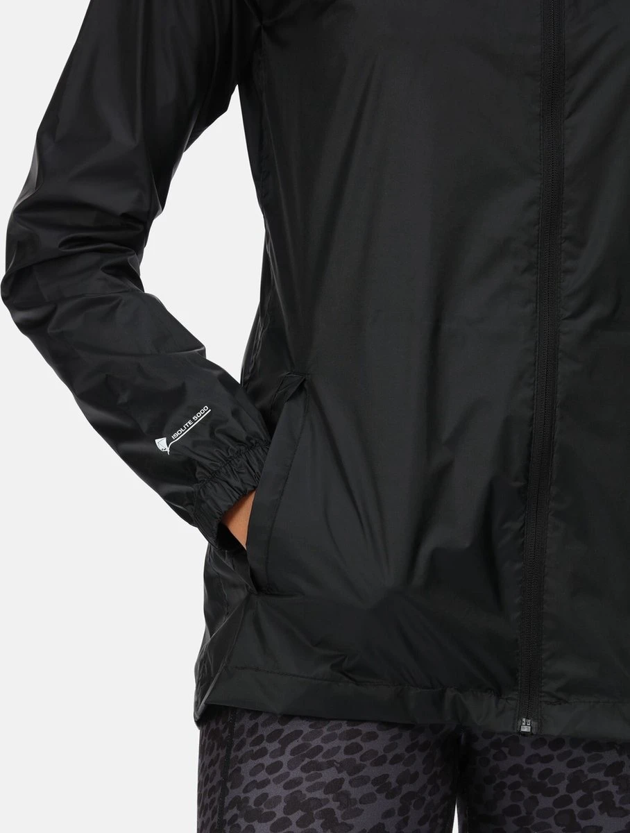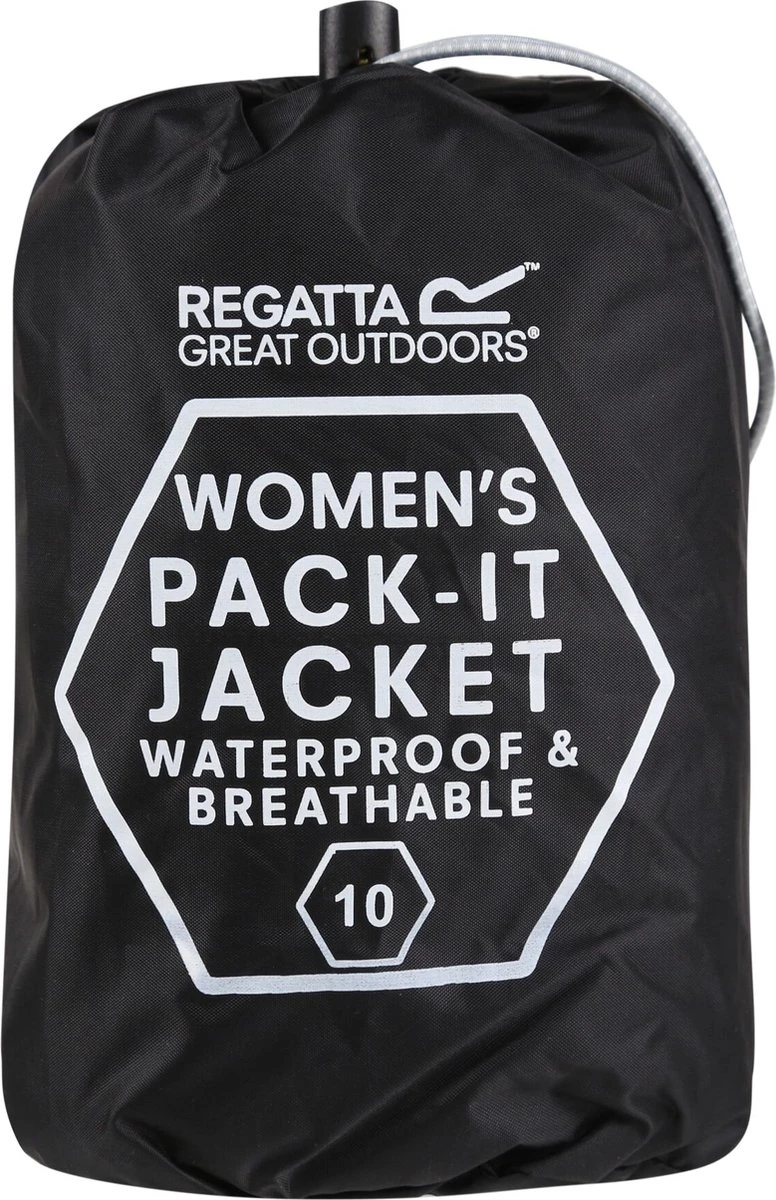 De Pack-It Jacket van Regatta voor dames is gemaakt van waterbestendig en ademend ISOLITE 5000-polyamide en heeft een verstelbare capuchon, een dunne drukknoopsluiting, twee handige zakken en een kleine draagzak. Met Regatta-opdruk op de borst.