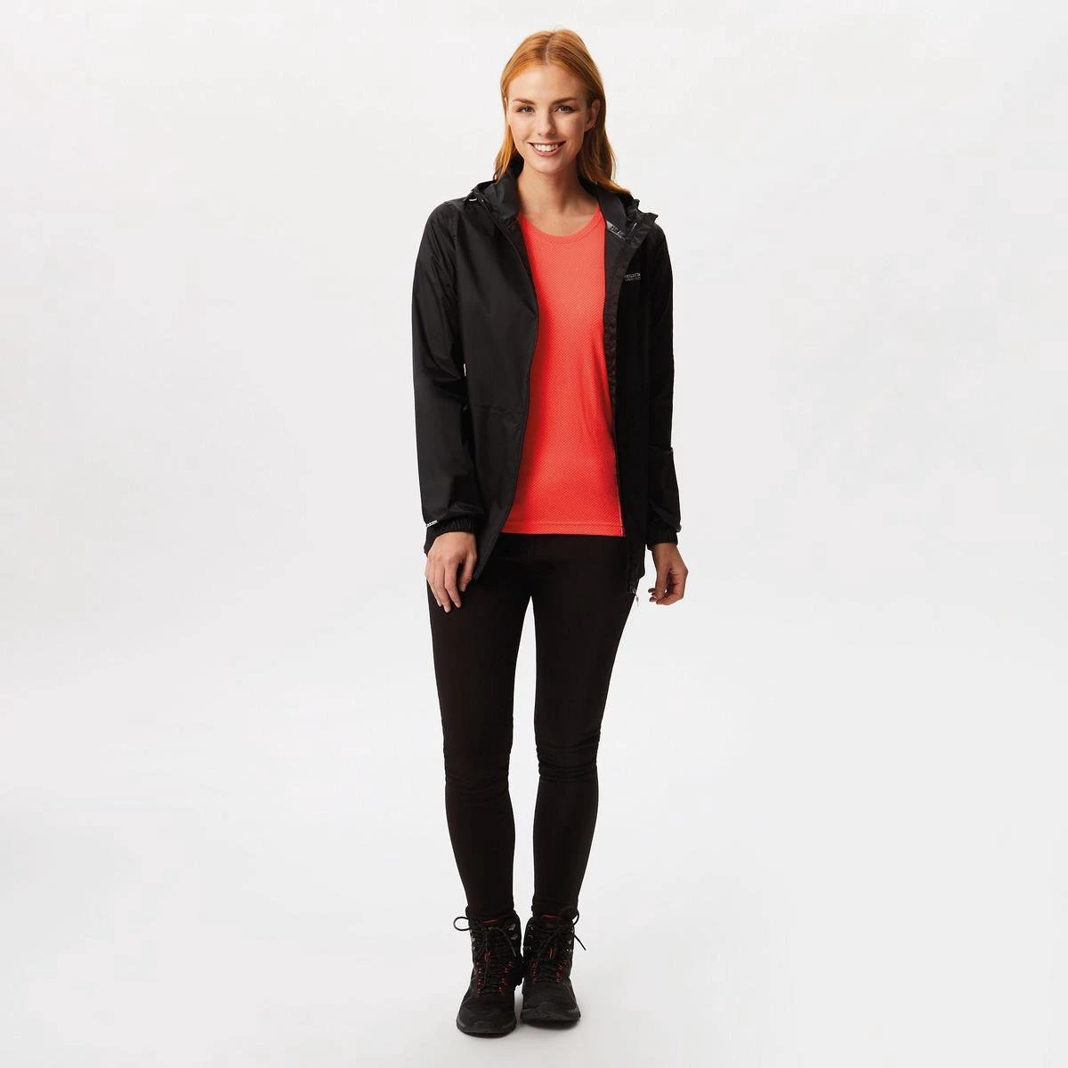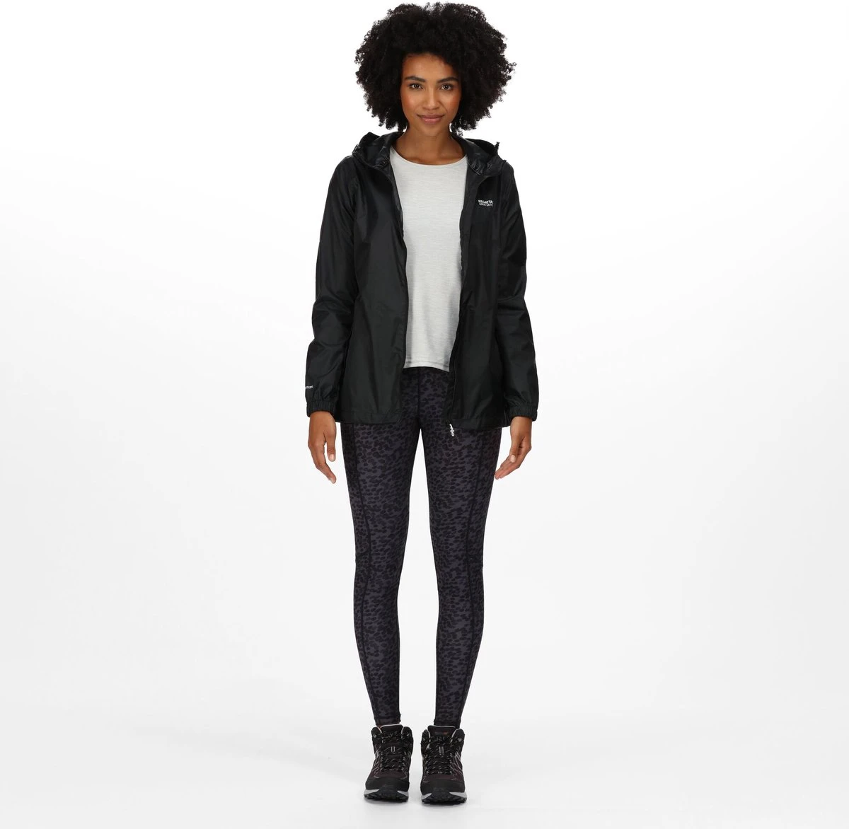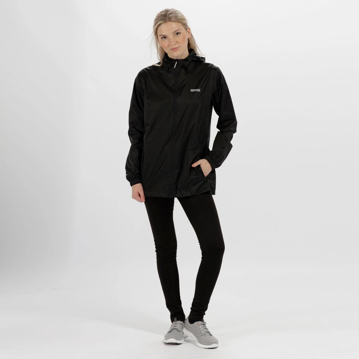 De Pack-It Jacket van Regatta voor dames is gemaakt van waterbestendig en ademend ISOLITE 5000-polyamide en heeft een verstelbare capuchon, een dunne drukknoopsluiting, twee handige zakken en een kleine draagzak. Met Regatta-opdruk op de borst.