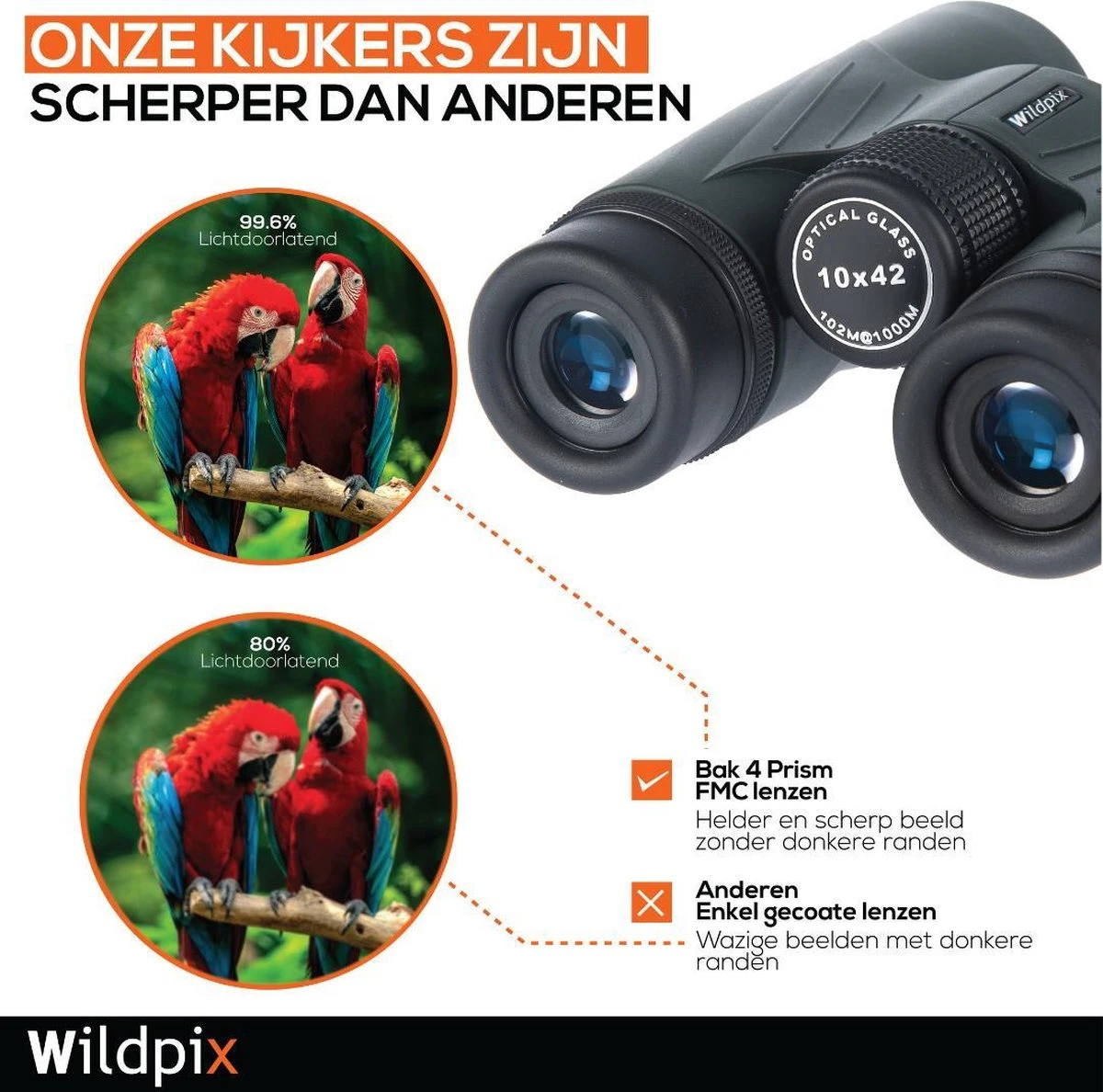Zie alles haarscherp dankzij de full multi-coated lenzen van de Wildpix EAGLE. Het BAK4 prisma zorgt ervoor dat de kijker al het licht maximaal doorlaat zonder last te hebben van verstoringen. Door deze krachtige features is deze heldere kijker in elke situatie te gebruiken.